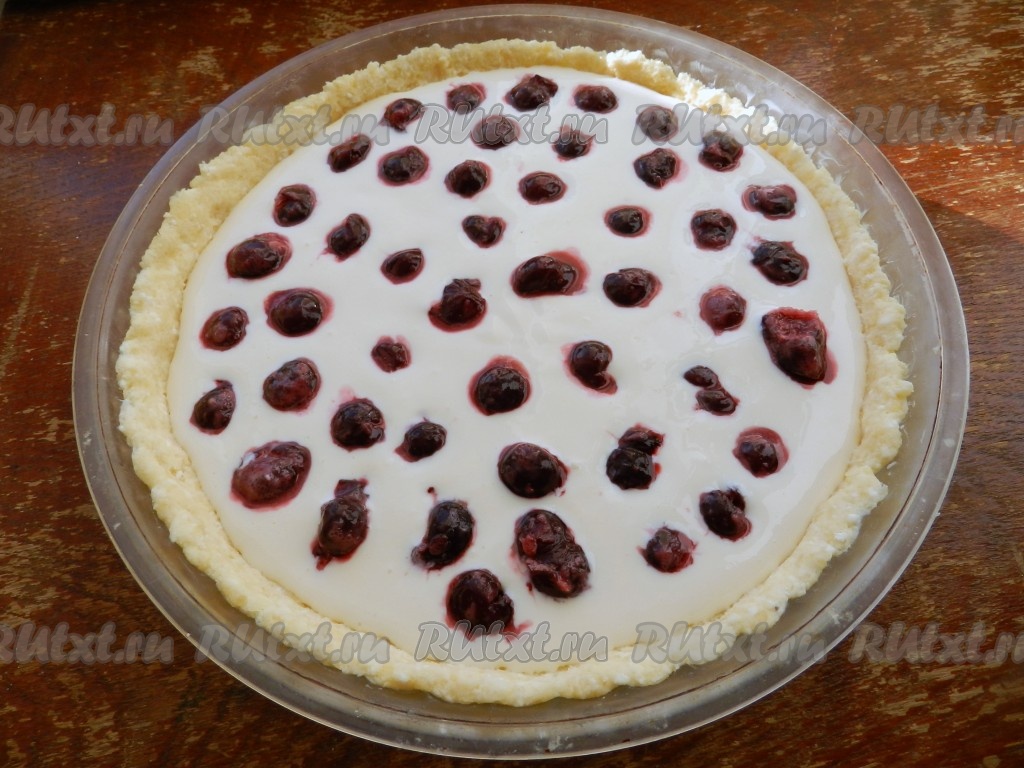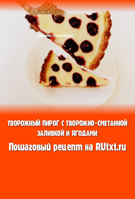 Для получения творожно-сметанной заливки в отдельной миске нужно творог растереть вилкой с яйцом и 100 граммами сахара, добавить сметану, перемешать до однородности. Тесто достать из холодильника, вылить на него заливку и выложить ягоды. Поставить форму в разогретую до 180 градусов духовку, выпекать творожный пирог с творожно-сметанной заливкой и ягодами 35-40 минут. Заливка должна схватится.