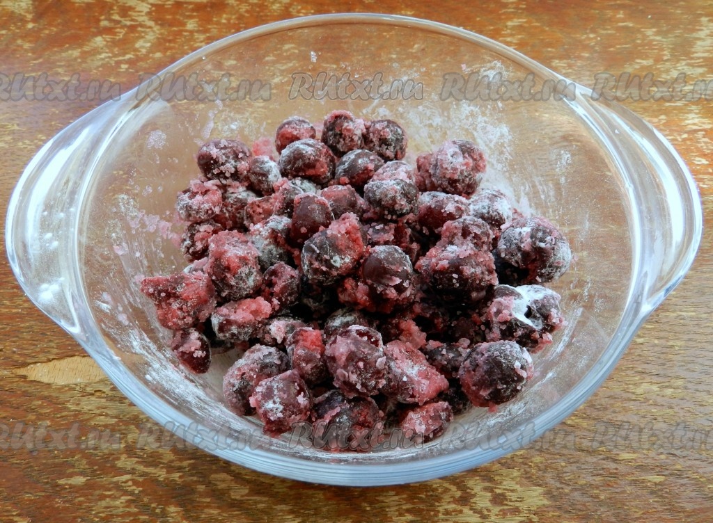 Этот пирог можно готовить с любыми свежими или замороженными ягодами. Свежие ягоды (у меня - вишня) нужно будет промыть водой, если косточки крупные (как, например, у вишни, черешни), тогда косточки нужно будет удалить. Немного обсушить ягоды, разложив их на бумажном полотенце. Если ягоды заморожены и на них немного льда, значит их можно не размораживать. 200 грамм подготовленных ягод (у меня - вишня без косточек) переложить в миску, добавить 1 столовую ложку крахмала и 1 столовую ложку сахара, перемешать.