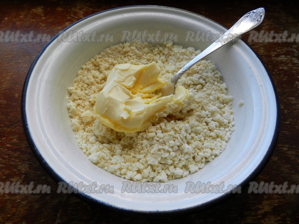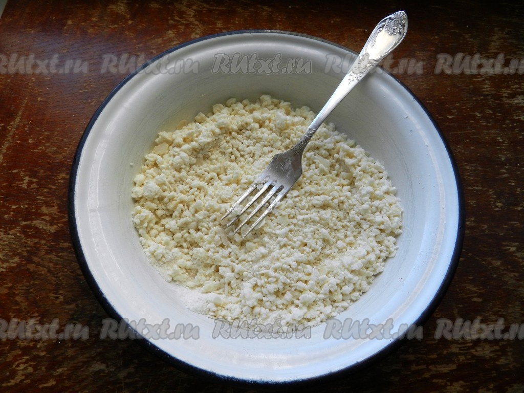 Прежде всего замесим творожное тесто. Сливочное масло должно быть комнатной температуры, поэтому достаньте из холодильника его заранее. Для замешивания теста нужно в миске соединить муку с разрыхлителем и сахаром, добавить творог, растереть вилкой до однородности.