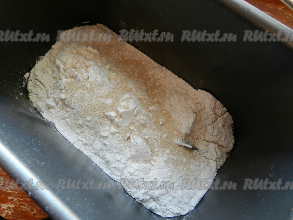 В контейнер хлебопечки выложить ингредиенты в следующем порядке: вода, соль, сахар, масло, оба вида муки (предварительно смешать вместе), дрожжи.