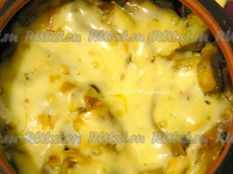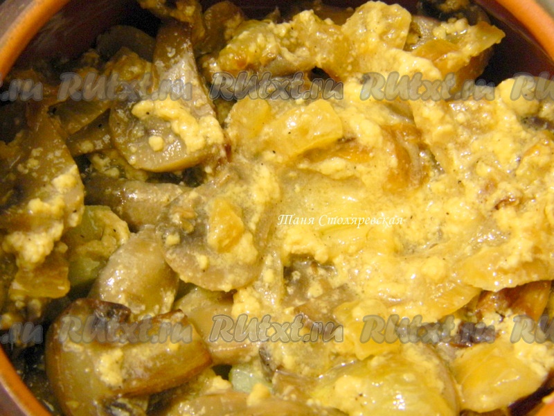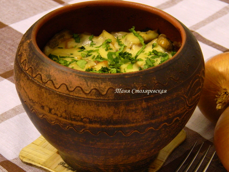 И поставить горшочек с картошкой и грибами запекаться в духовку на 30 минут при температуре 150 градусов.