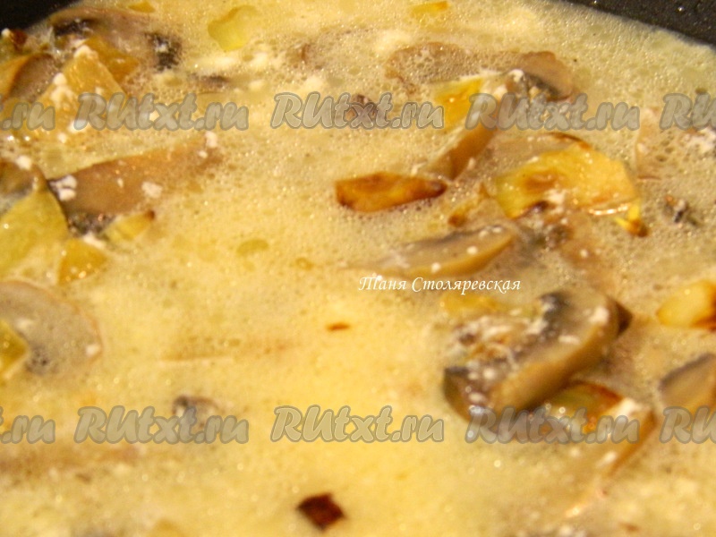 Затем влить йогурт (можно сметану), грибной бульон и прокипятить 10 минут.