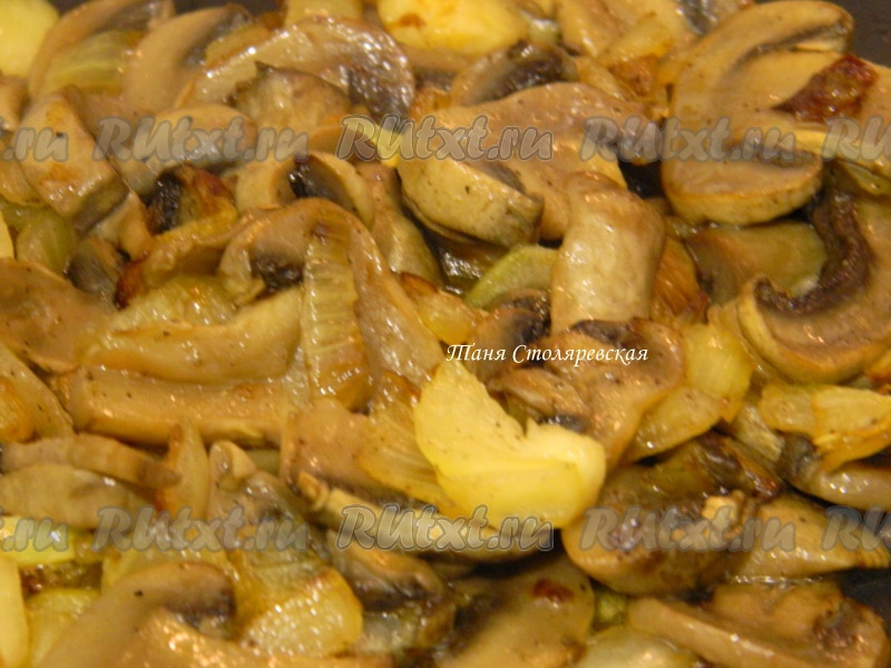 Лук обжарить до золотистого цвета, добавить грибы и еще немного пожарить.