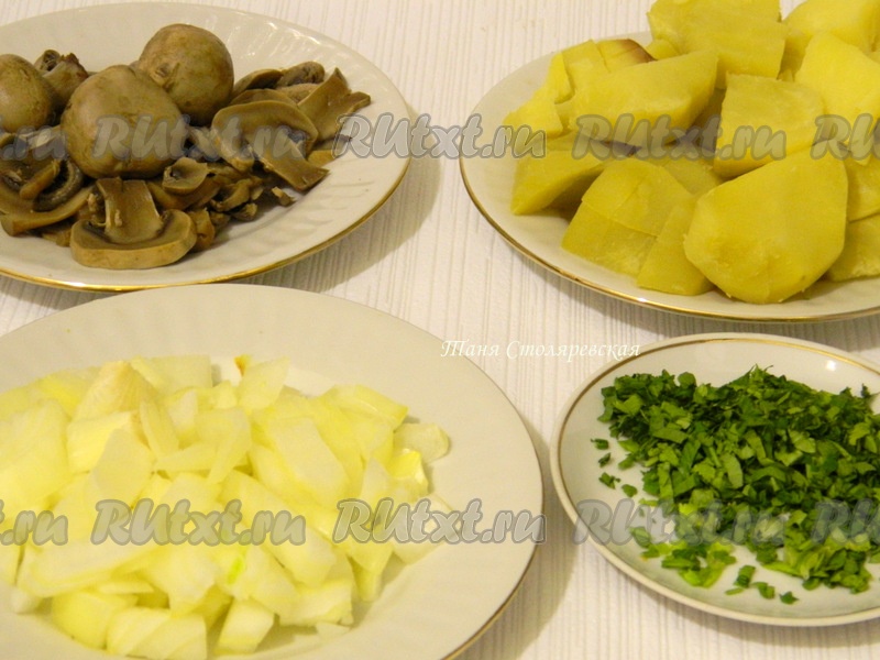 Картофель и грибы предварительно отварить. Немного бульона, в котором варились грибочки, оставить. Картофель, грибы, зелень, лук порезать.