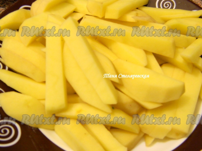 Высыпаем в маринад нарезанное соломкой филе. Оставляем на ночь в холодильнике.