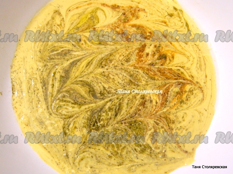 Высыпаем соль, специи по вкусу и перемешиваем. Если маринад покажется вам густым, добавьте воды.
