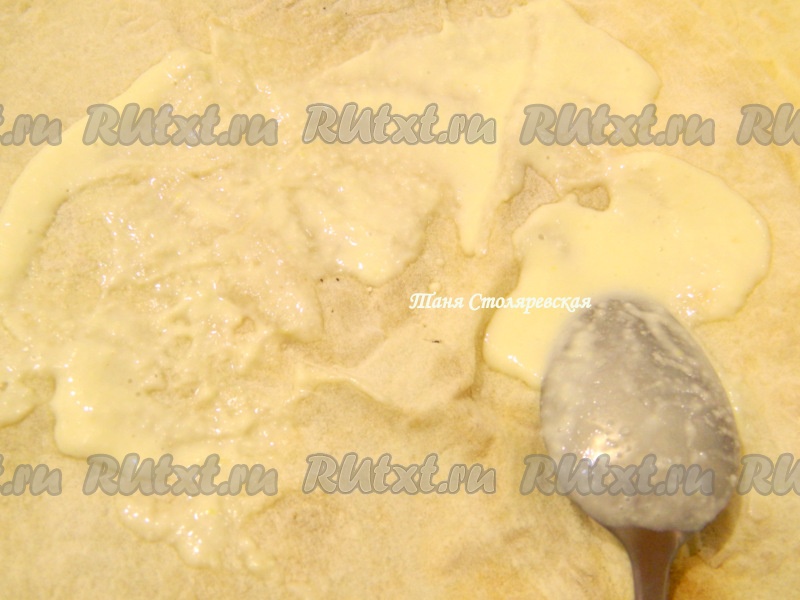 Сначала наносим слой приготовленного чесночного соуса, но немного чтобы лаваш не размяк.