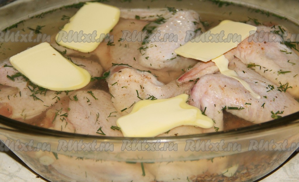 На пропаренную гречку выложить курочку и кусочки сливочного масла. Закрыть плотно крышкой и отправить в духовку.