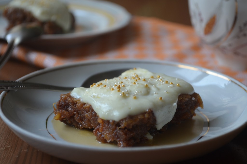 Сочный, нежный пирог с хурмой, грецкими орехами и творожной глазурью готов.