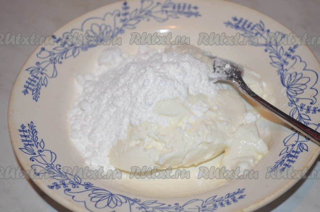 Для творожной глазури тщательно растереть творог с сахарной пудрой.