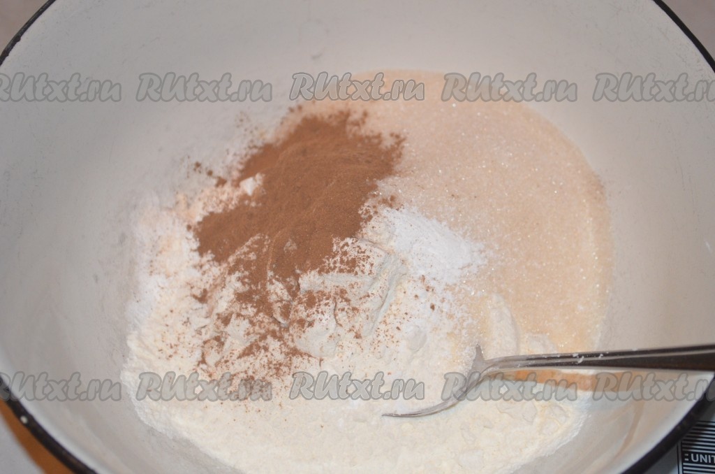 В миску просеять муку с солью, разрыхлителем и корицей.