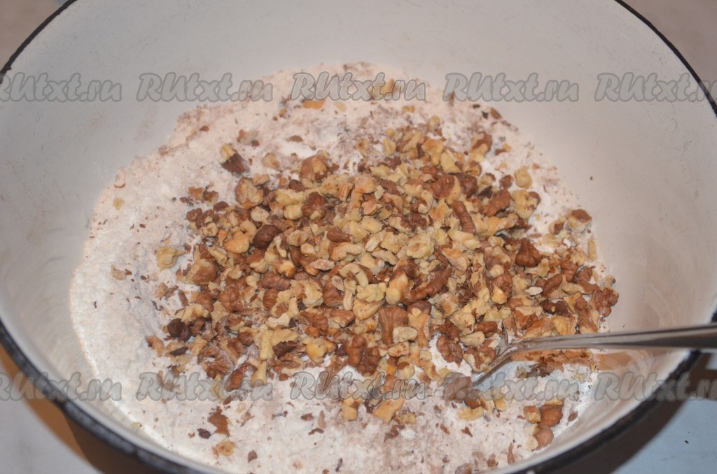 Грецкие орехи обжарить на сухой сковороде, а затем порубить в среднюю крошку. Добавить в мучную смесь.