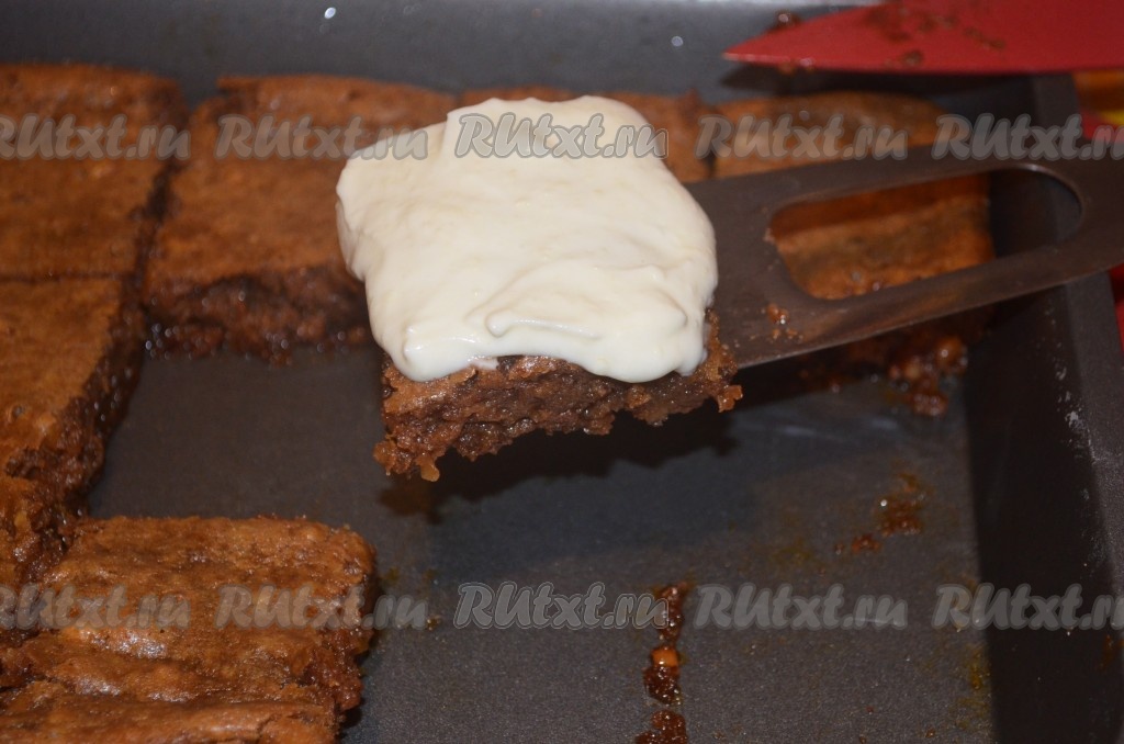 Готовый пирог с хурмой и грецкими орехами нарезать на порционные кусочки, сверху полить творожной глазурью. Дать застыть.