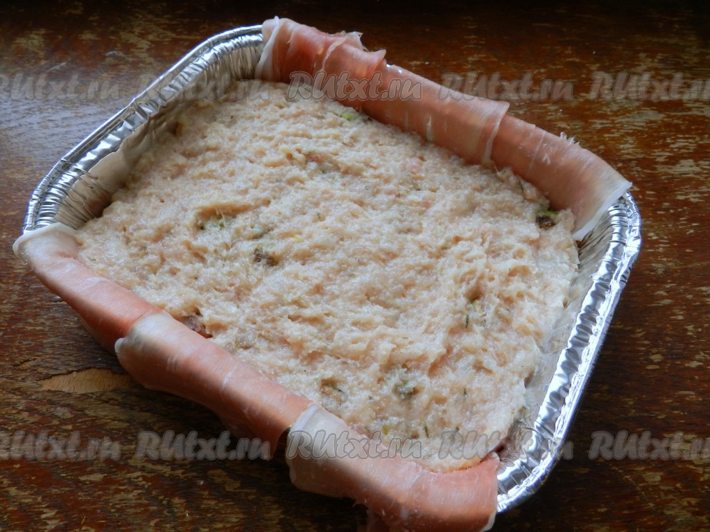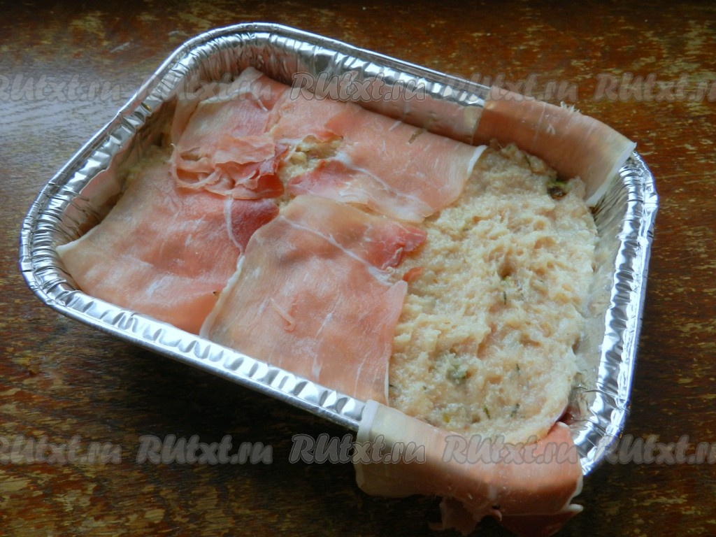 Концы бекона завернуть на фарш. Запекать суфле из индейки в разогретой духовке при температуре 190 градусов 30-35 минут.