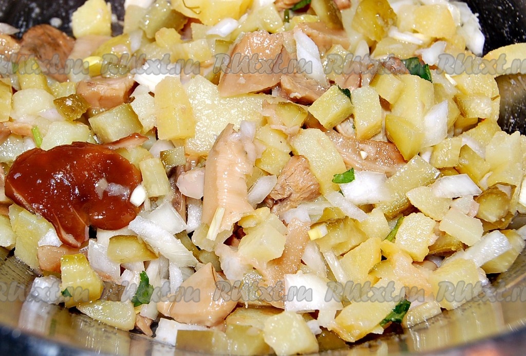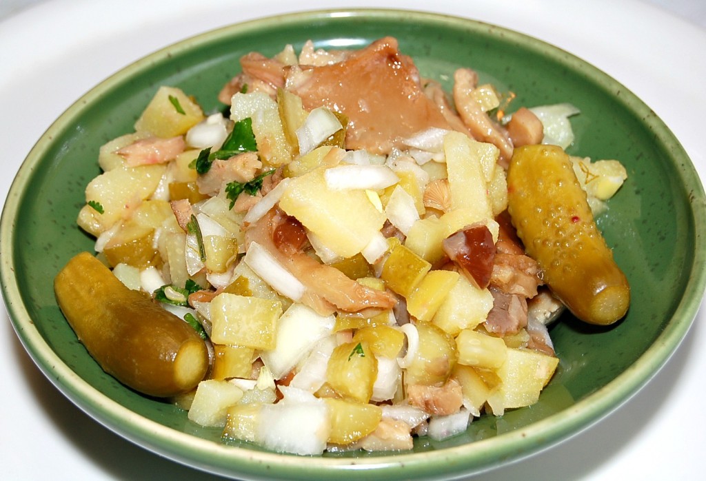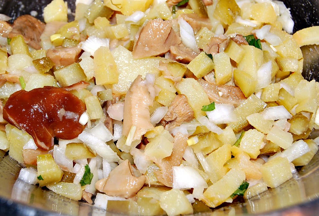 Картофельный салат с солёными грибами и огурцами - прекрасное постное блюдо. Этот салатик можно подать в качестве закуски к повседневному столу. Относится он к типичным блюдам русской кухни, обладает ярким, насыщенным вкусом и лёгкой пикантностью. Попробовав это салат, вы, наверняка, будете готовить его достаточно часто!