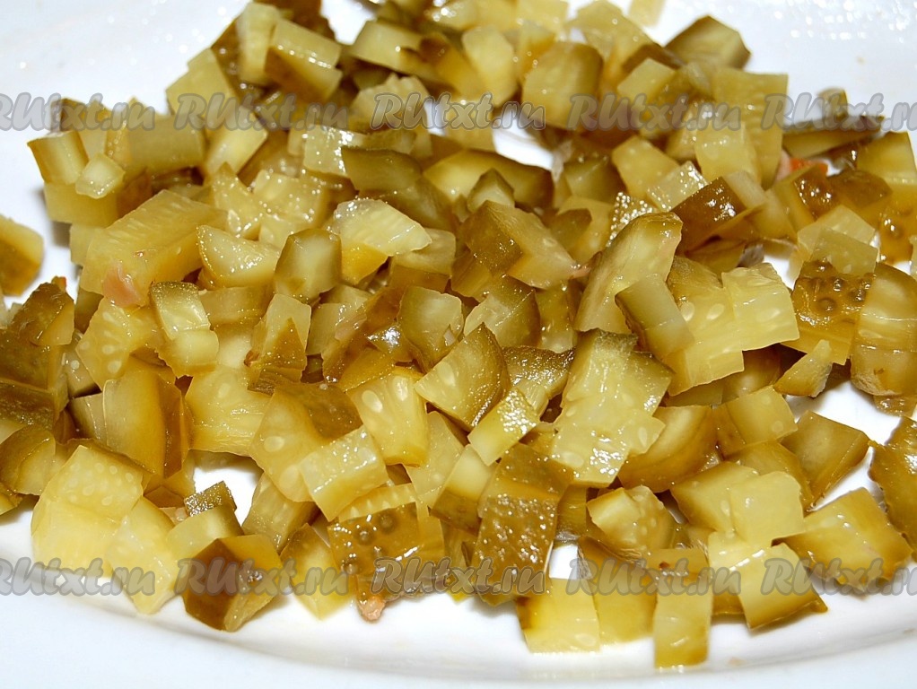 Картофель отварить в мундире (на варку потребуется минут 20-25, готовая картошка должна легко прокалываться ножом, но при этом она не должна развариться), охладить, очистить от кожуры и нарезать небольшими кубиками.