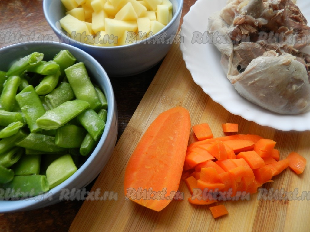 Когда мясо индейки сварится, достать его из бульона, также достать луковицу и морковь. Лук выкинуть. Морковь нарезать кубиками, мясо нарезать кусочками. Бульон процедить, довести до кипения, добавить в него очищенный и нарезанный на небольшие кубики картофель, кусочки индейки и нарезанную варёную морковь, посолить, поперчить и варить с момента закипания 7-8 минут на небольшом огне. Если стручковая фасоль свежая, отрежьте "хвостики" с двух сторон, а затем разрежьте каждый стручок на 2-3 части. Если фасоль заморожена, размораживать её предварительно не нужно.