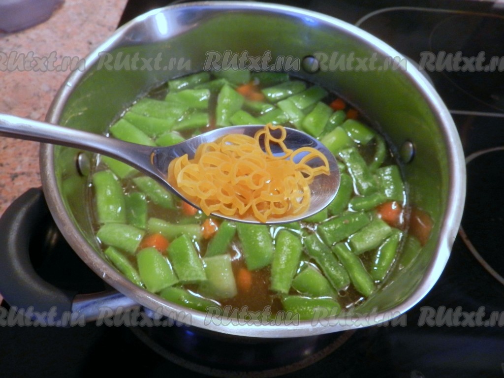 Затем в суп с индейкой добавить нарезанную стручковую фасоль и макаронные изделия. Довести до кипения, уменьшить огонь и варить суп ещё 7-8 минут. Этого времени достаточно, чтобы сварились фасоль, картошка и макароны.