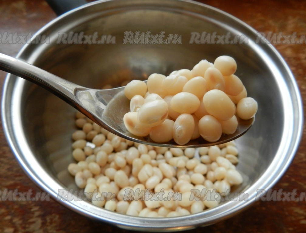 Фасоль заранее замочить в холодной воде на несколько часов или на ночь. Затем воду слить, снова залить фасоль большим количеством воды и отварить до готовности. В середине варки фасоль посолить. Воду слить, фасоль остудить.