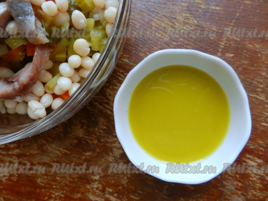 Добавить в винегрет отваренную фасоль. Филе сельди очистить от кожи и костей и нарезать тонкими полосками.