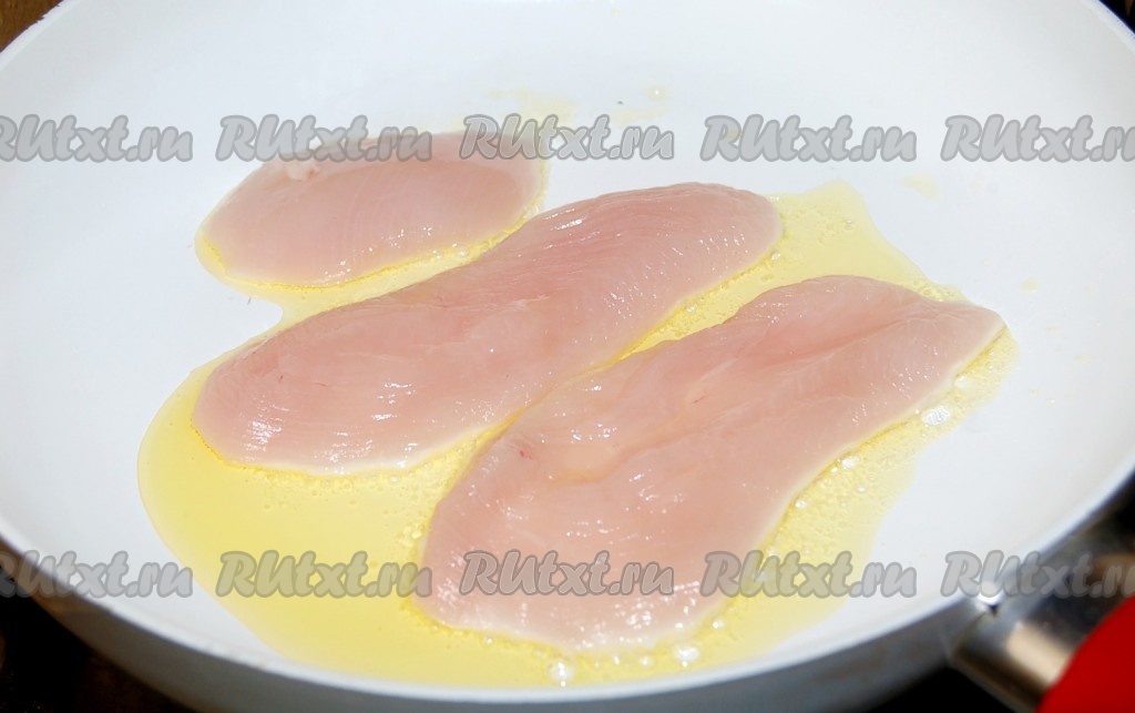 Филе курицы нарезать тонкими пластинками и обжарить на оливковом масле.