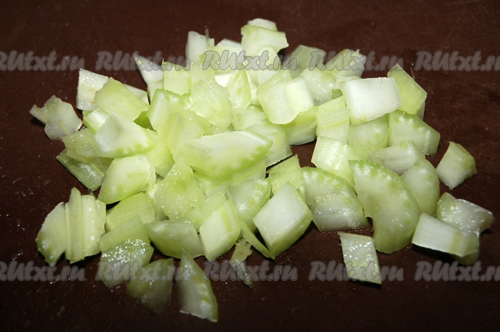 Черешковый сельдерей очистить от внешних волокон и нарезать тонкими кусочками.