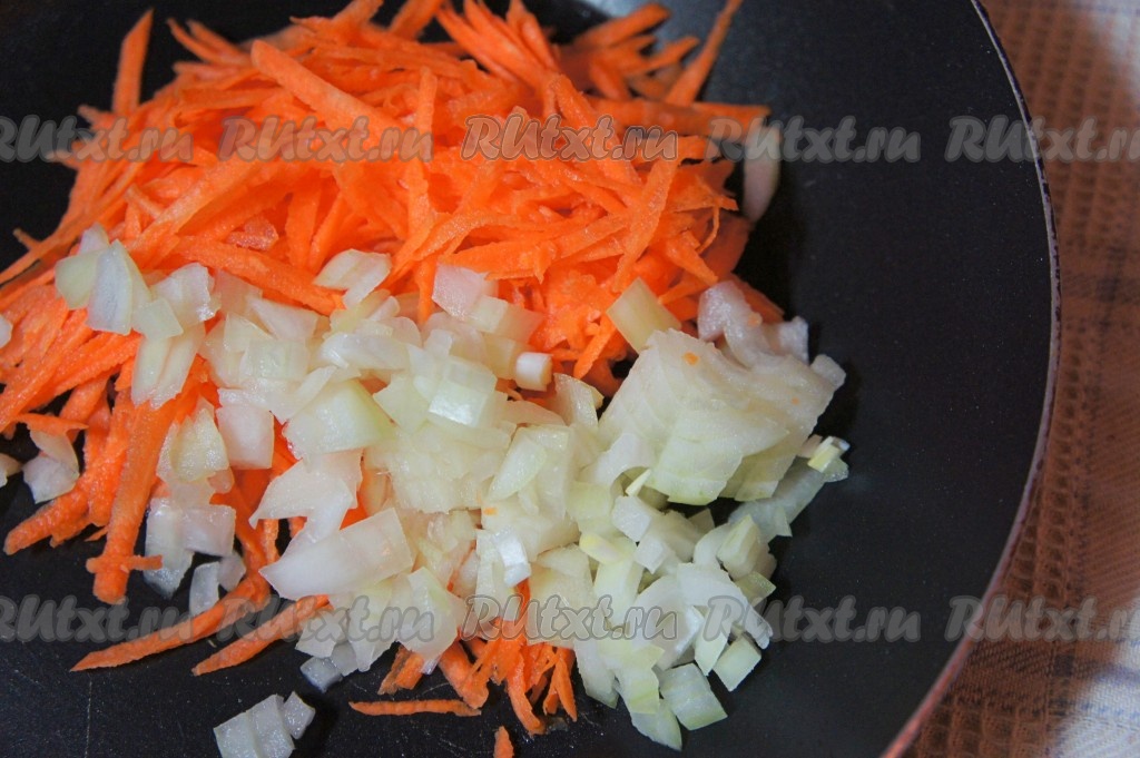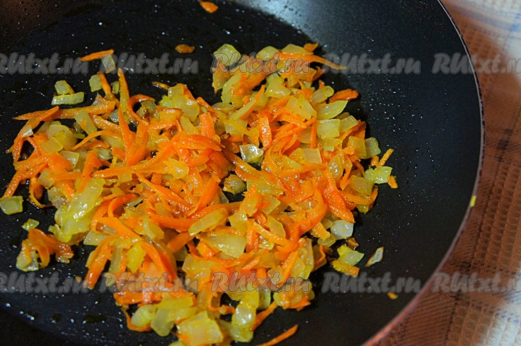 Добавить немного растительного масла и слегка обжарить овощи на среднем огне. Добавить обжаренные овощи в куриный бульон.