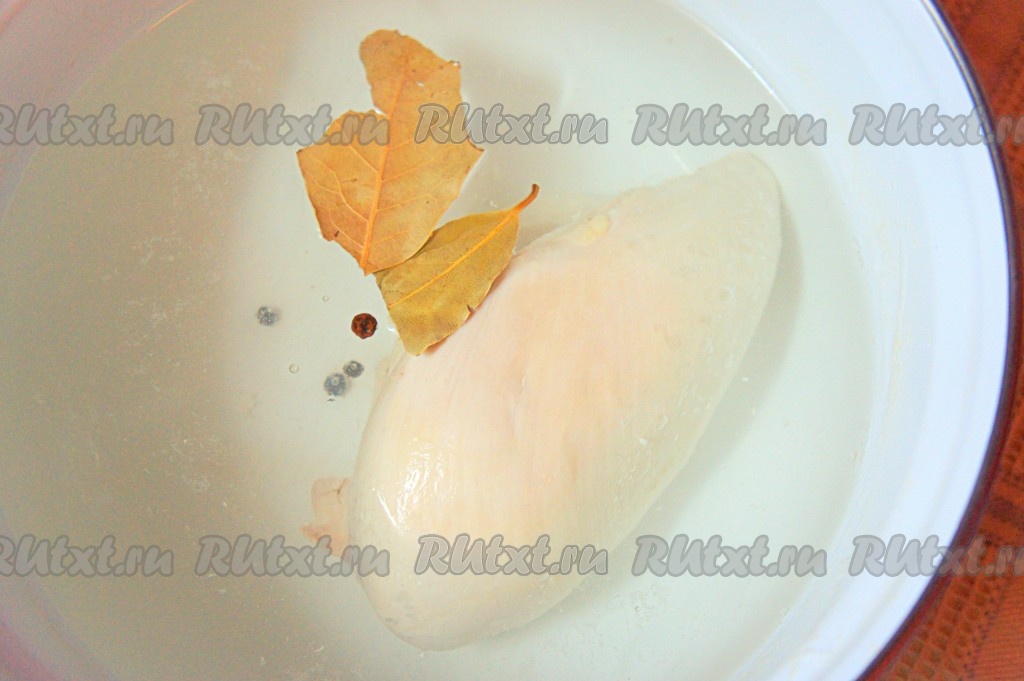 Куриную грудку промыть, залить 2 литрами холодной воды, добавить лавровый лист, перец горошком и поставить на средний огонь. Готовить 10 минут, периодически снимая накипь.