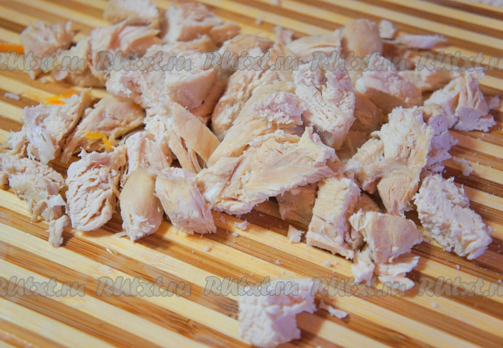 Достать куриное мясо, нарезать его и снова отправить в щи.