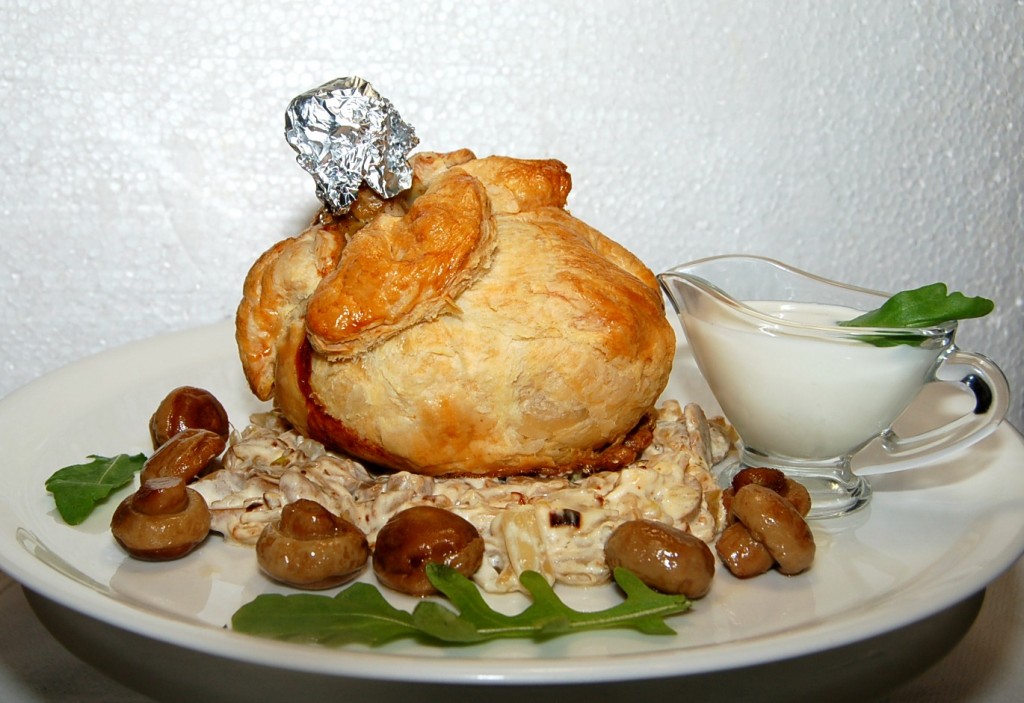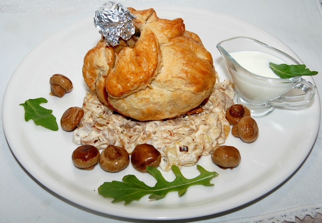 Когда все будет готово, можно сервировать тарелку. Сначала выложить соус, на соус установить запеченную куриную ножку в слоеном тесте, рядом разбросать жареные шампиньоны и налить сметану в маленький соусник.