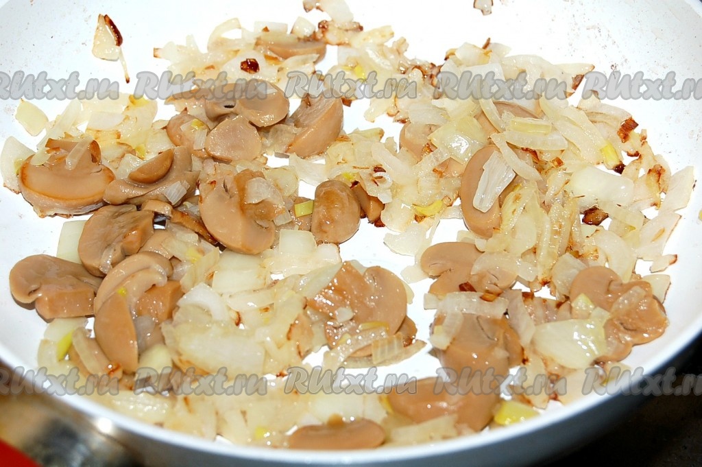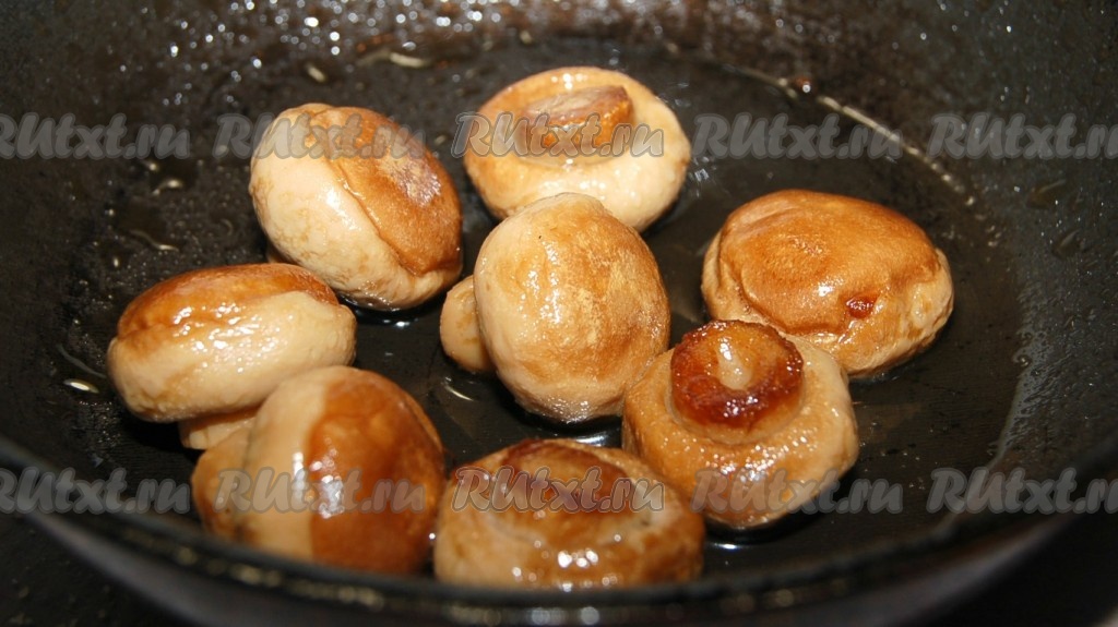 Для украшения маленькие шампиньоны целиком обжарить на отдельной сковородке до легкой румяности.