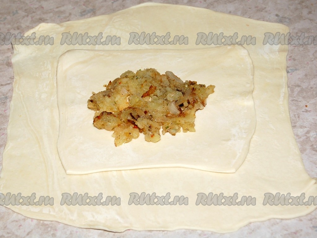Слоеное тесто раскатать на два квадрата разных размеров: один побольше, другой поменьше. На квадрат большего размера уложить квадрат меньшего размера и в центр второго квадрата выложить гарнир из картофеля с луком.