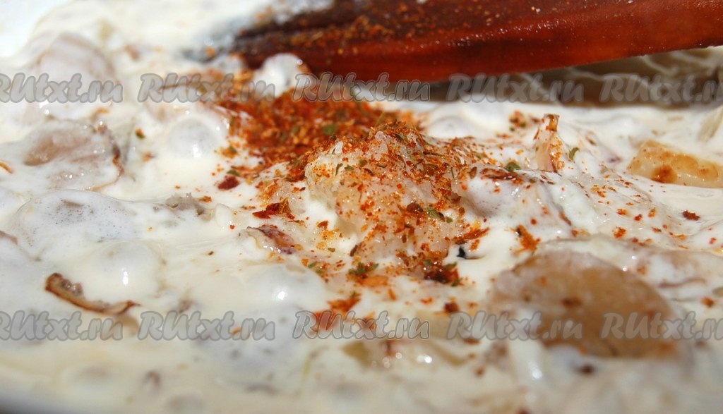 Когда лук с шампиньонами будет почти готов, добавить к ним сливки.