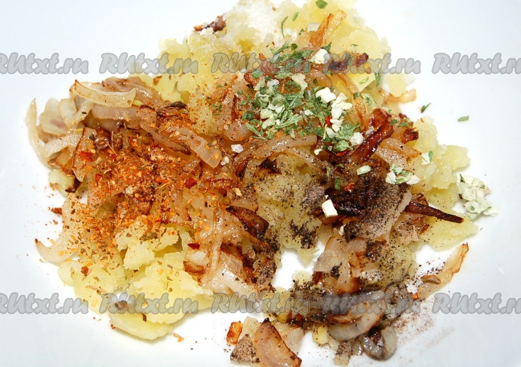 Для внутреннего гарнира отварной картофель размять, добавить обжаренный репчатый лук, соль и специи. Перемешать.