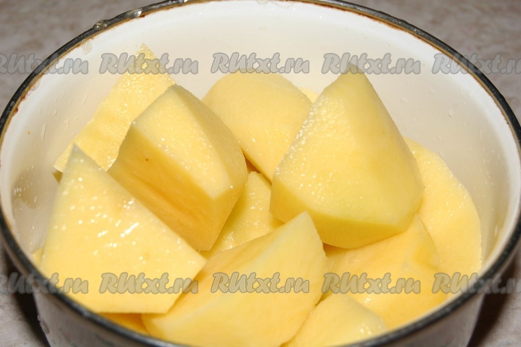 Поставить на огонь кастрюлю с водой, добавить крупно нарезанный картофель и варить до полуготовности картофеля.