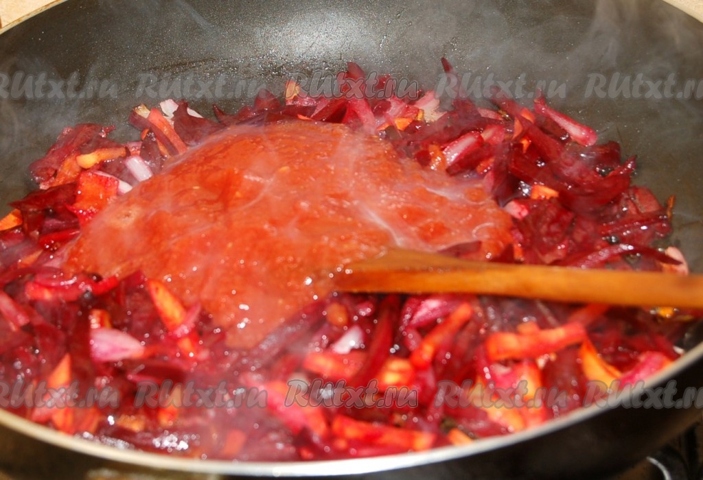Затем добавить томатное пюре, перемешать и жарить почти до готовности.
