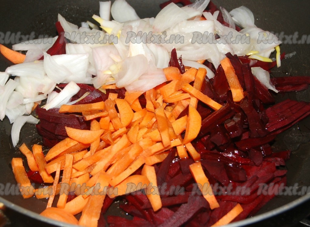 Свеклу, морковь нарезать тонкими брусочками, лук репчатый мелко нарезать и все обжаривать на растительном масле до полуготовности.