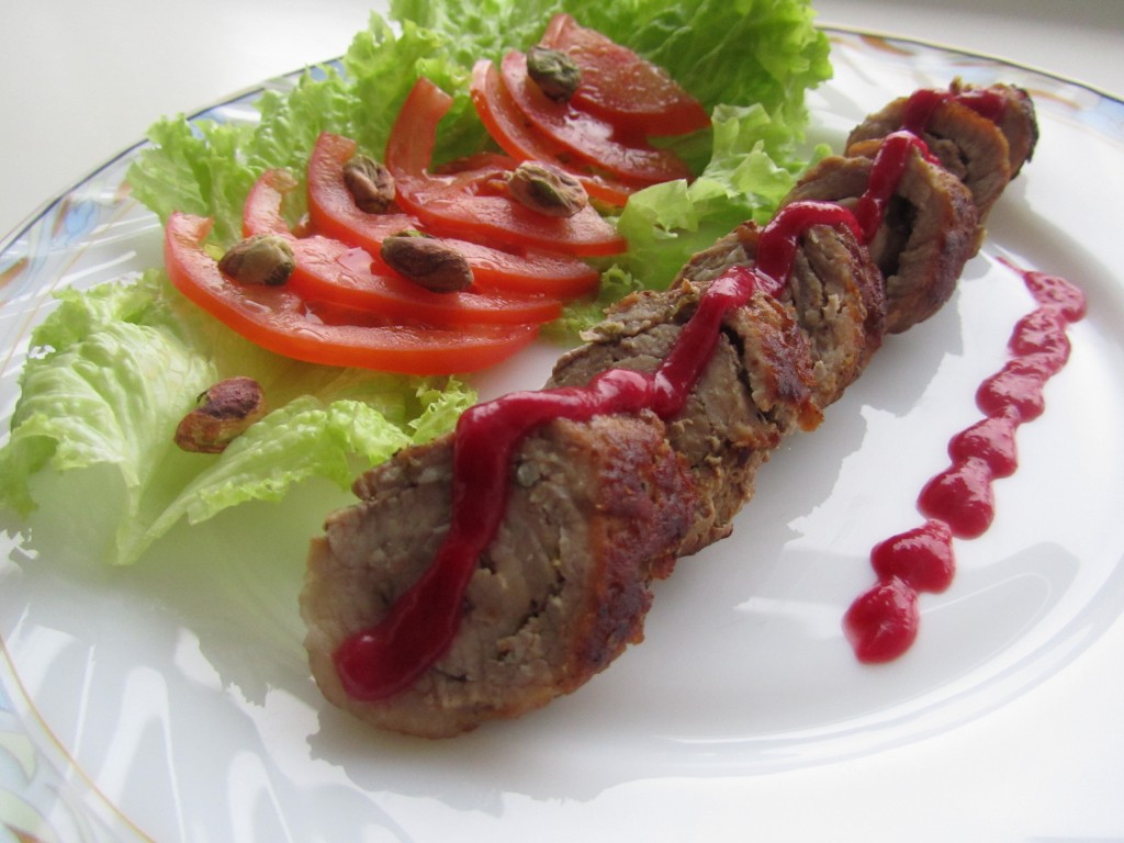 Перекладываем сочный, вкусный, нежный рулетик из свинины со сковороды на тарелку, режем на кусочки, поливаем соусом (я приготовила для этого блюда клюквенно-апельсиновый соус) и подаём с нарезкой из овощей к столу.