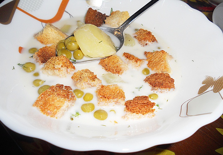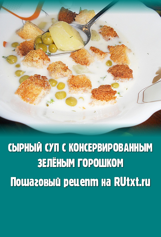 Сырный суп, приготовленный с консервированным зелёным горошком, отлично впишется в повседневное меню. К столу подаём в горячем виде, дополнив сухариками и нарезанным укропом.