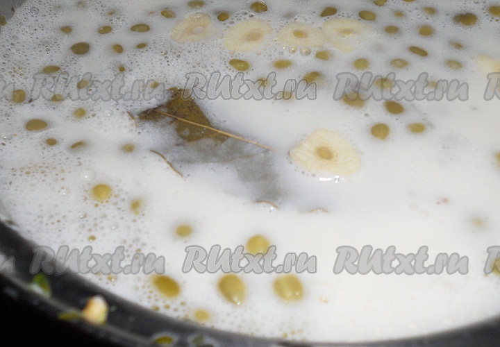 Затем добавить консервированный горошек и нарезанный на дольки чеснок, дать закипеть, снять с огня.