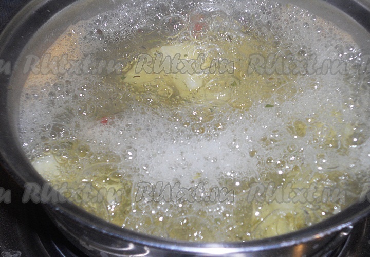 Поставить кастрюлю с водой на плиту, когда вода закипит, добавить очищенный и нарезанный картофель, специи, дать закипеть, а затем варить на небольшом огне минут 15 (до готовности картошки).