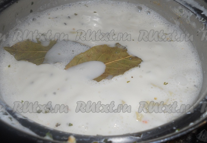 Когда картошка будет готова, выложить сырную массу в кастрюлю, лавровый лист, посолить по вкусу, проварить, помешивая, на небольшом огне до полного расплавления сыра.