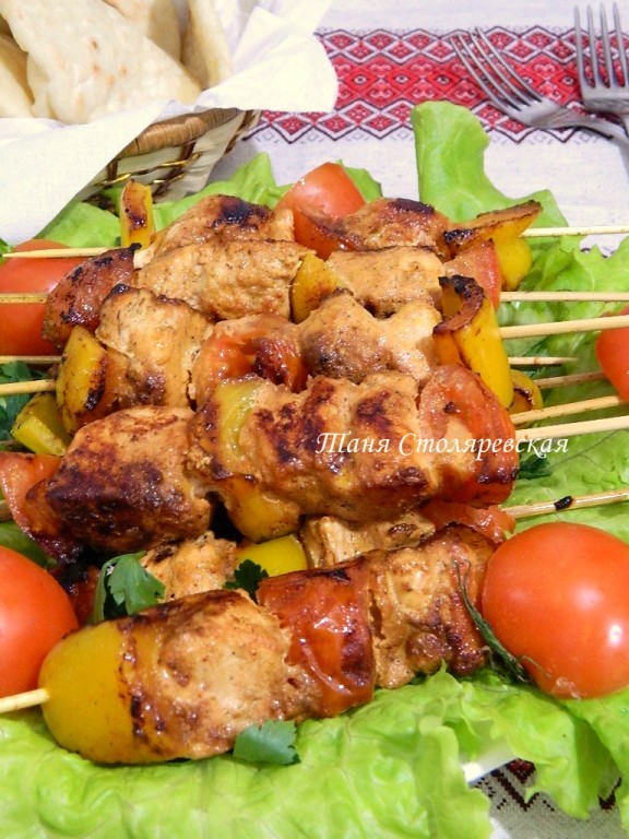 Сочный, ароматный, аппетитный шашлык из курицы с овощами, приготовленный на шпажках в духовке, подать сразу же к столу. Очень вкусно с лавашом и кисло-сладким соусом.