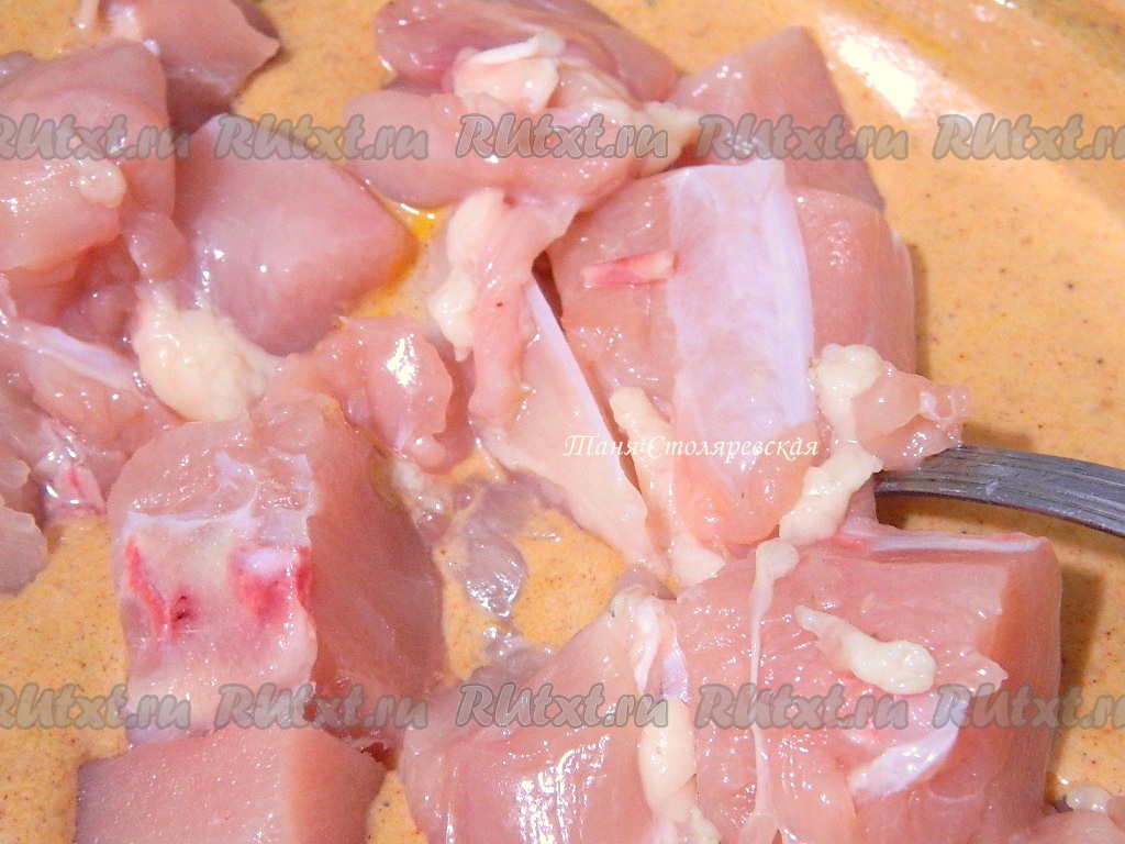 Нарезать куриное филе на кусочки размером до 3-х сантиметров.