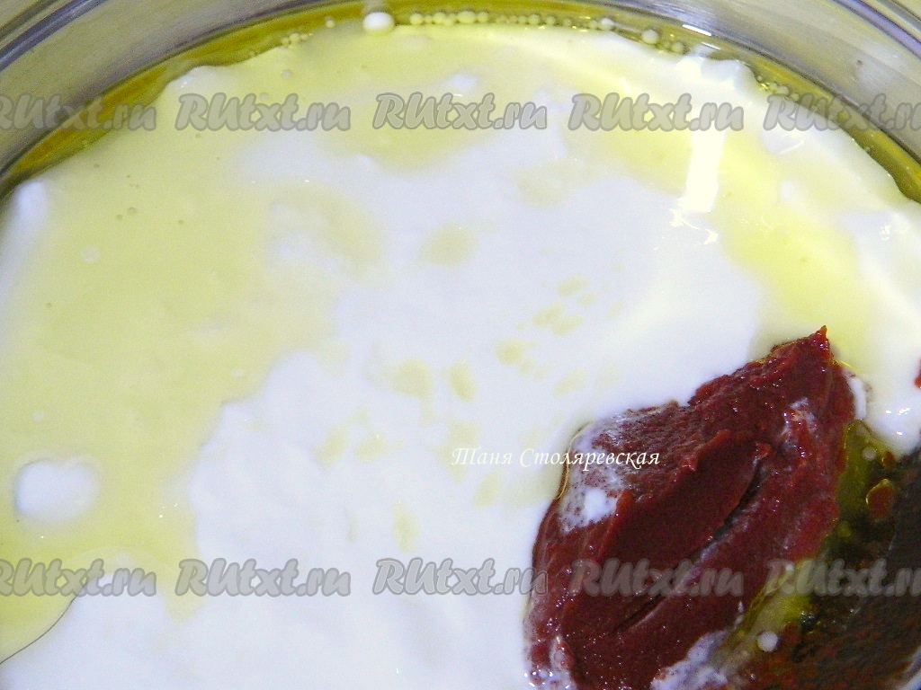 Вначале приготовим маринад, для этого в глубокую миску нужно влить растительное масло и уксус, выложить томатную пасту и сметану.