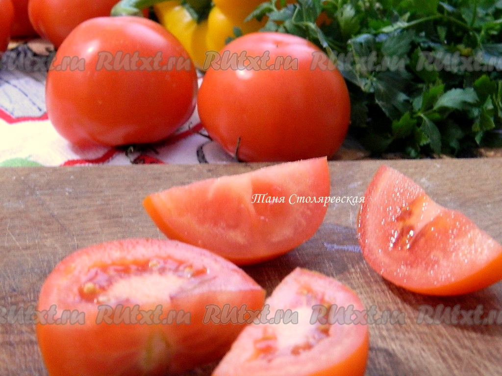 Помидоры нарезать на дольки. Помидоры нужно выбирать плотные, чтобы они не "размякли" во время запекания.