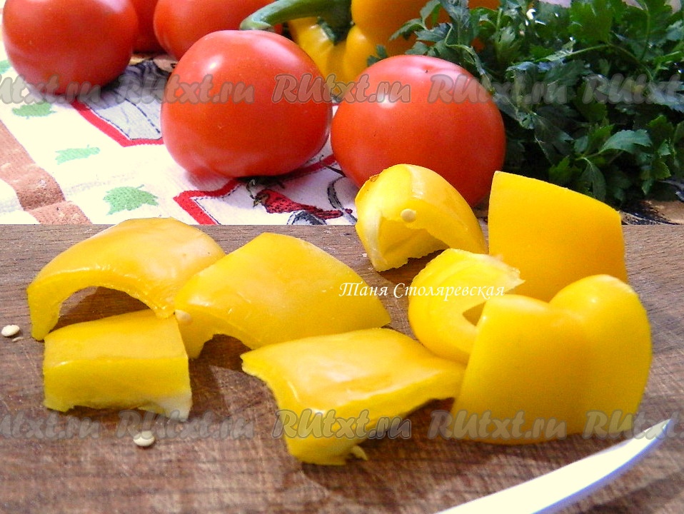 Из болгарского перца удалить семена и плодоножку. Нарезать перец на кусочки размером 2 см на 3 см.