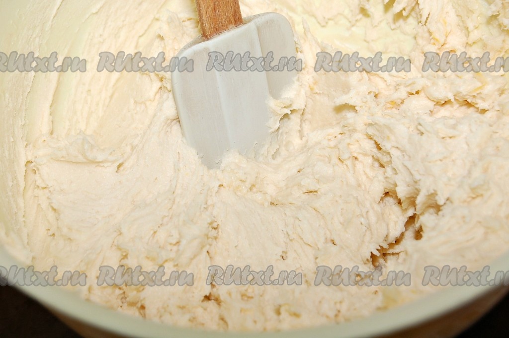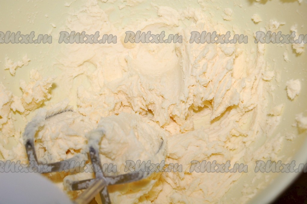 Соединить в миске сливочное масло и сахар. Сливочное масло должно быть комнатной температуры. Взбить масло с сахаром миксером до состояния пышности.