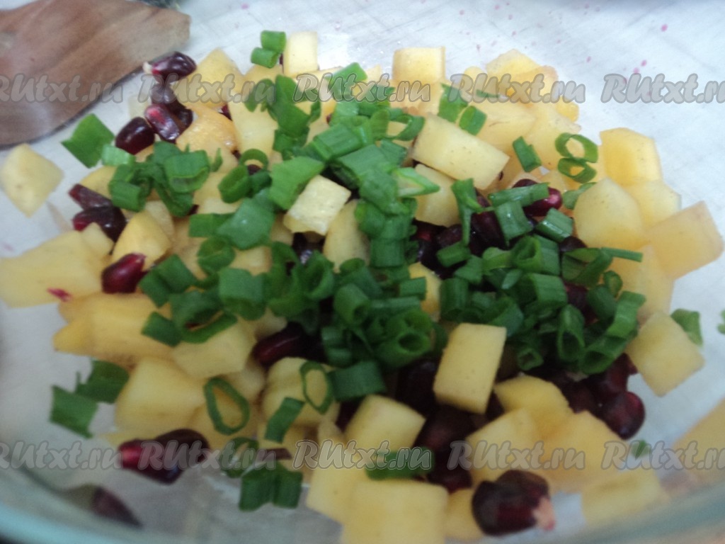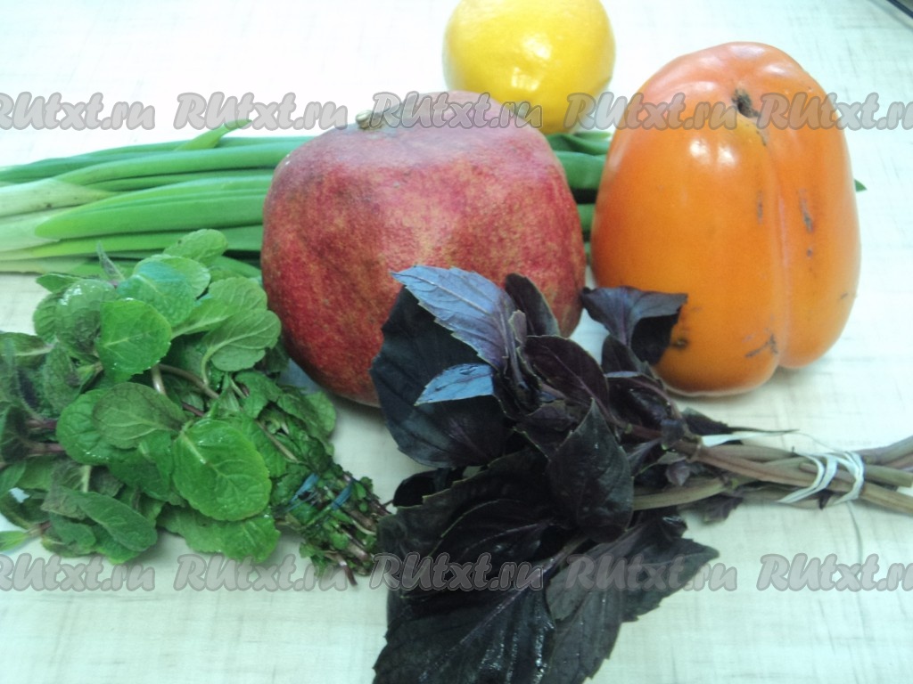 Хурму очистить от кожуры и нарезать мелким кубиком. Смешать хурму с зернами граната, рубленым зеленым луком, мятой и базиликом. Заправить соком лайма или лимона, приправить теми же специями, в которых мариновали мясо. Добавить немного воды, чтобы смесь была более влажной. Перемешать.