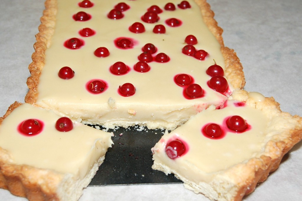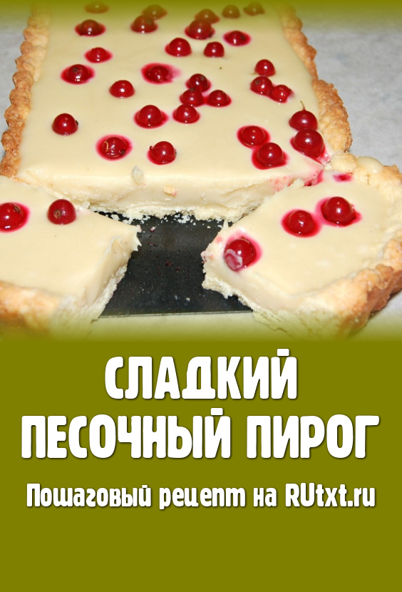 Пирог из нежного песочного теста со сладкой начинкой отлично подойдет для чаепития. Сладкая начинка состоит из растопленного белого шоколада со сливками. Ягоды красной смородины, которые дополняют сладкую начинку, делают пирог изысканным, с тонким вкусом и просто восхитительным. Хранить такой песочный пирог нужно в прохладном месте, чтобы сладкая нежная начинка не растаяла и стала еще нежнее.
